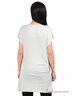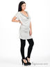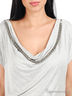 Однотонная туника с круглым глубоким вырезом в легкую сборку. Изделие украшено металлической цепочкой декорированной стразами.