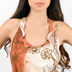 Пляжное платье с оригинальным принтом и завязками на шее. Тонкий пояс продет в шлевки и украшен пластиковой пряжкой.