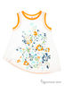 Туника выполнена из мягкой эластичной ткани с округлым вырезом горловины и без рукавов. Рукава не обработаны и имеют вставку из контрастной ткани. Горловина также окаймлена контрастной тканью. Спереди тунику украшает веселый оригинальный принт. Хороший выбор для маленькой модницы!