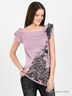 Стильная туника из тонкого, приятного на ощупь кулирного трикотажа. Широкий округлый вырез горловины. Короткие рукава-крылышки. Плечо декорировано оригинальной рюшей. На полочке оригинальная драпировка и великолепный печатный рисунок, дополненный флоком и стразами. Будьте всегда стильной и женственной!