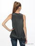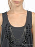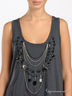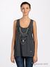 Трикотажная туника приглушенного темно-зеленого цвета. Глубокая круглая горловина. Широкие проймы. Особая изюминка туники - спинка из искристого шифона. Модель декорирована бусинами и цепочками.