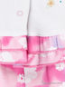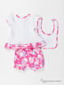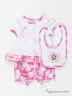 Оригинальный комплект для девочки состоит из: туники с короткими рукавами и застежкой на кнопки, шортики на поясе-резинке и слюнявчик.