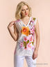 Туника летняя нарядная, полуоблегающая. Горловина V-образная, отделана контрастной планкой. Рукавов нет, присутствует отделка планкой в тон горловине. Длина средняя, до линии бедер.