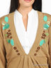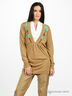 Трикотажная туника светло-коричневого цвета - отличный оттенок для осени. Глубокая V-образная горловина прекрасно подчеркивает грудь. Полочка декорирована пластиковыми и деревянными бусинами. Длинные рукава с манжетами. Заниженная талия подчеркнута поясом. Комфортная и стильная модель из натурального льна.