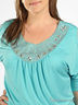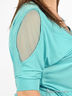 Блузка свободного покроя из эластичного, приятного на ощупь материала. Широкая круглая горловина, украшенная стазами. Короткие цельнокройные рукава с манжетами. На плечах вставки из сетчатой ткани.