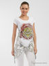 Очаровательная туника с короткими рукавами и округлым вырезом горловины. Модель выполнена из легкого материала контрастной расцветки и декорирована ассиметричным низом. Изделие приталенного покроя. Прекрасный вариант для создания модного образа.
