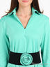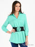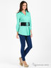 Детали: отложной воротник на небольшой стойке, V-образный вырез горловины, длинные рукава, в комплекте стильный пояс из отделочного материала, небольшие манжеты на пуговице с оригинальной сборкой