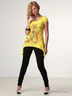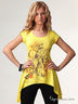 Туника из вискозного полотна с асимметричным решением низа украшена большой романтичной печатью на полочке.