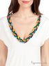 Детали: V-образный вырез горловины, короткий рукав, низ изделия посажен на резинку; вырез горловины декорирован "косичкой" из переплетения шнурочков, цепочки и бисера