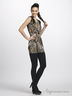 Стильная туника оригинального дизайнерского кроя из тонкой эластичной ткани. V-образный вырез горловины с запахом декорирован оригинальными складками. Плечи декорированы гипюровыми вставками и аппликацией. На талии пояс.