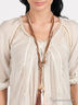 Детали: V-образный вырез горловины, длинный рукав, вытачки, украшена тесьмой, бусы в комплекте