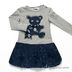 Детали: округлый вырез горловины, застежка на две пуговицы на плечике, длинный рукав, велюровая юбка-баллон, полочка украшена нашивками и декоративными элементами, юбка декорирована пайетками