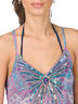 Расклешенная туника с отрезным лифом. Регулируемые бретельки. Спинка посажена на многорядную резинку. Спереди Вышивка из бусин и пайеток. По низу изделия оборки.