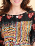 Детали: округлый вырез горловины декорирован пуговицами, цельнокроенный широкий короткий рукав