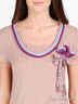 Детали: округлый вырез горловины, короткий рукав, боковые разрезы, вырез горловины контрастно декорирован, брошка на полочке отстегивается