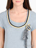 Детали: округлый вырез горловины, короткий рукав, боковые разрезы, вырез горловины контрастно декорирован, брошка на полочке отстегивается