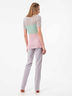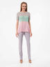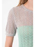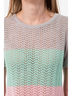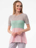 Летний джемпер приталенного силуэта серо-розового цвета с втачными рукавами. Джемпер выполнен в технике «ручного вязания» из натуральных нитей с содержанием хлопка. Круглый вырез изделия и низ рукавов обработаны двусторонней лицевой бейкой.