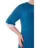 Утонченное мини-платье силуэта «трапеция» синего цвета. Изделие выполнено в технике ручного вязания из нитей с добавлением шерсти. Круглый вырез изделия обработан двусторонней лицевой бейкой. Низ втачных рукавов дополнен ажурным кружевом белого цвета.