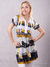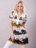 Яркая повседневная туника расклешенного силуэта с короткими рукавами. Выполнена из слегка эластичного материала джерси. Отложной воротник с небольшим разрезом спереди. Отрезной топ на втачном поясе. Полочка украшена рюшами. Изделие имеет оригинальный узор. Прекрасный вариант на каждый день!