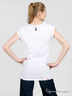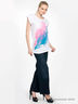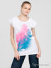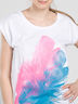 Туника из мягкого трикотажа белого цвета. Широкий округлый вырез горловины оформлен эластично трикотажной резинкой. Цельнокроеные рукава. Свободный силуэт. Вытачки с оборками. Оригинальный рисунок-принт на передней части изделия.