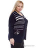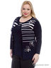 Отличный твинсет из полувискозного материала. Округлый вырез горловины. Кардиган с длинным рукавом. Застежка на полочках. Декорирован широкими горизонтальными полосами и оригинальными принтами.