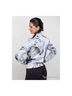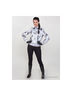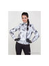 Оригинальная укороченная ветровка из гладкой ткани с оригинальным принтом. Воротник- стойка. Длинные рукава с манжетами на резинке. В районе локтя вставка, собранная на резинке. Два прорезных кармана.