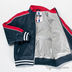Модель прямого кроя с воротником-стойкой застегивается на молнию. Два передних кармана на молнии. Манжеты и низ изделия - трикотажные резинки. Контрастные вставки на рукавах. Нашивка на полочке, вышивка на спинке.
