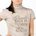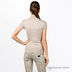 Водолазка с коротким рукавом выполнена из вискозного трикотажа средней плотности. Высокий двойной воротник-гольф представлен комбинированной резинкой. Короткий рукав присборен по окату и имеет неширокую манжету. Полочка изделия декорирована аппликацией в виде надписи из металлических заклепок.