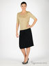 Юбка прямого кроя из тонкой ткани с шелковистой подкладкой. Застежка- молния, пуговица. Декоративная прострочка. Сзади изделия шлица.