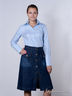 Оригинальная юбка трапециевидного кроя - прекрасное дополнение к повседневному гардеробу, а так же для веселых вечеринок. Джинсовая ткань. Застегивается на пуговицы спереди. Два накладных кармана.