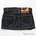 Расклешеная модель застегивается на молнию и пуговицу. К поясу пришиты петли для ремня. Два передних кармана, два задних кармана. Декоративные элементы: потертости на подоле, справа спереди подол в складку, вышивка на задних карманах.
