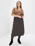 По переду расположена кокетка из однотонной ткани и две талиевые вытачки. Спинка со среднем швом и шлицей. Застежка сзади на молнию.