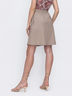 Короткая юбка-трапеция с карманами в боковых швах, дополненными декоративными клапанами. Спинка изделия присобрана на резинку. Застегивается на молнию и пуговицу.
