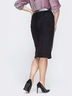 Экстравагантная юбка-карандаш из комбинированных тканей: полочка выполнена из искусственной кожи, а спинка – из мягкой замши. Спереди изделие дополнено разрезом и контрастной серебряной планкой, украшенной брошью. Застегивается сзади на скрытую молнию.