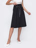 Юбка-трапеция из костюмной ткани, декорированная контрастной лентой, продетой через люверсы. Застегивается на потайную молнию сзади.