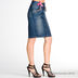 Стильная прямая юбка с разрезом сзади из джинсовой ткани. Втачной пояс и шлевки для ремня, застежка на молнии и на пуговице, четыре прорезных кармана, отделаны цепочкой золотого цвета в качестве декора. Длина юбки по колено, сзади с одной шлицей.