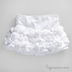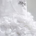 Модель на широкой кокетке застегивается на скрытую молнию в левом боковом шве. Множественные различные оборки, в том числе из жесткой сетки. На самом верхнем слое нашиты многослойные цветы, трепещущие при ходьбе и на ветру как сотни бабочек. Кокетка декорирована узором из страз.