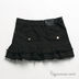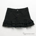 Слегка расклешенная модель застегивается на пуговицу и молнию. В пояс вставлена резинка, пришиты шлевки. Два передних кармана. Имитация задних карманов на кнопке. К подолу пришиты оборки с необработанным краем.