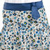 Легкая женская юбка-клеш на широкой кокетке. Посажена на пояс темно-синего цвета. К поясу сбоку пришита декоративная нашивка-галстук. Потайная молния-застежка вшита в один из боковых швов.