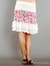 Летняя повседневная юбка расклешенного кроя из шелковистого нежного материала. Сверху вшитая резинка. Украшена вставками из ажурного кружева. Нижняя часть украшена многослойными воланами.