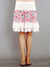 Летняя повседневная юбка расклешенного кроя из шелковистого нежного материала. Сверху вшитая резинка. Украшена вставками из ажурного кружева. Нижняя часть украшена многослойными воланами.