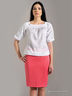 Юбка яркого цвета, летняя, средней длины, до колена, свободно облегающая по бедрам, слегка зауженная книзу, с вытачками, узким поясом, без карманов.