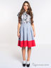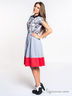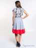 Пышная расклешенная юбка на поясе длиной ниже колена. Юбка со встречными складками состоит из двух тканей: верх хлопковый трикотаж, по низу контрастная отделка из плотного полиэстера. В среднем шве спинки расположена потайная молния.