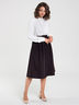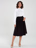 Женственная юбка клешеного силуэта с карманами в боковых швах выполнена из костюмной ткани. Удобную посадку на талии обеспечивает притачной пояс. Впереди застежка на петли и пуговицы.