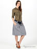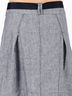 Детали: широкий втачной пояс с шлевками под ремень, шлевки выполнены в виде хлястика с пуговицей, текстильный ремень в комплекте, застежка на молнию и на две пуговицы, два прорезных кармана.