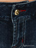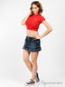 Детали: отрезной пояс со шлевками для ремня, застежка на пуговицу и молнию, два прорезных кармана спереди, два накладных с вышивкой сзади, модель декорирована воланами.