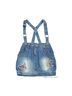 Юбка на лямках с двумя карманами, лямки регулируются, застежка на молнию. Украшена вышивкой. Оттенок джинсовой ткани может немного отличаться от представленной на фото.