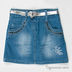 Стильная джинсовая юбка для девочки. Отрезной пояс со шлевками, пять карманов, в комплекте оригинальный ремешок. Декорирована пришивными стразами и вышивкой.