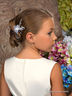 Декоративная серебристая шпилька, украшенная жемчужинами, кристаллами каплевидной формы, лепестками из органзы и воздушными перьями.