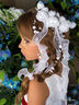 Роскошный гребень превосходно будет смотреться на распущенных волосах из-за нисходящих белых лент и декоративной прозрачной нити с жемчужинами и мелкими цветками. Крупные цветы – центральные элементы композиции – представлены в виде полураспустившихся бутонов роз из белого атласа. Листочки декорированы стразами.